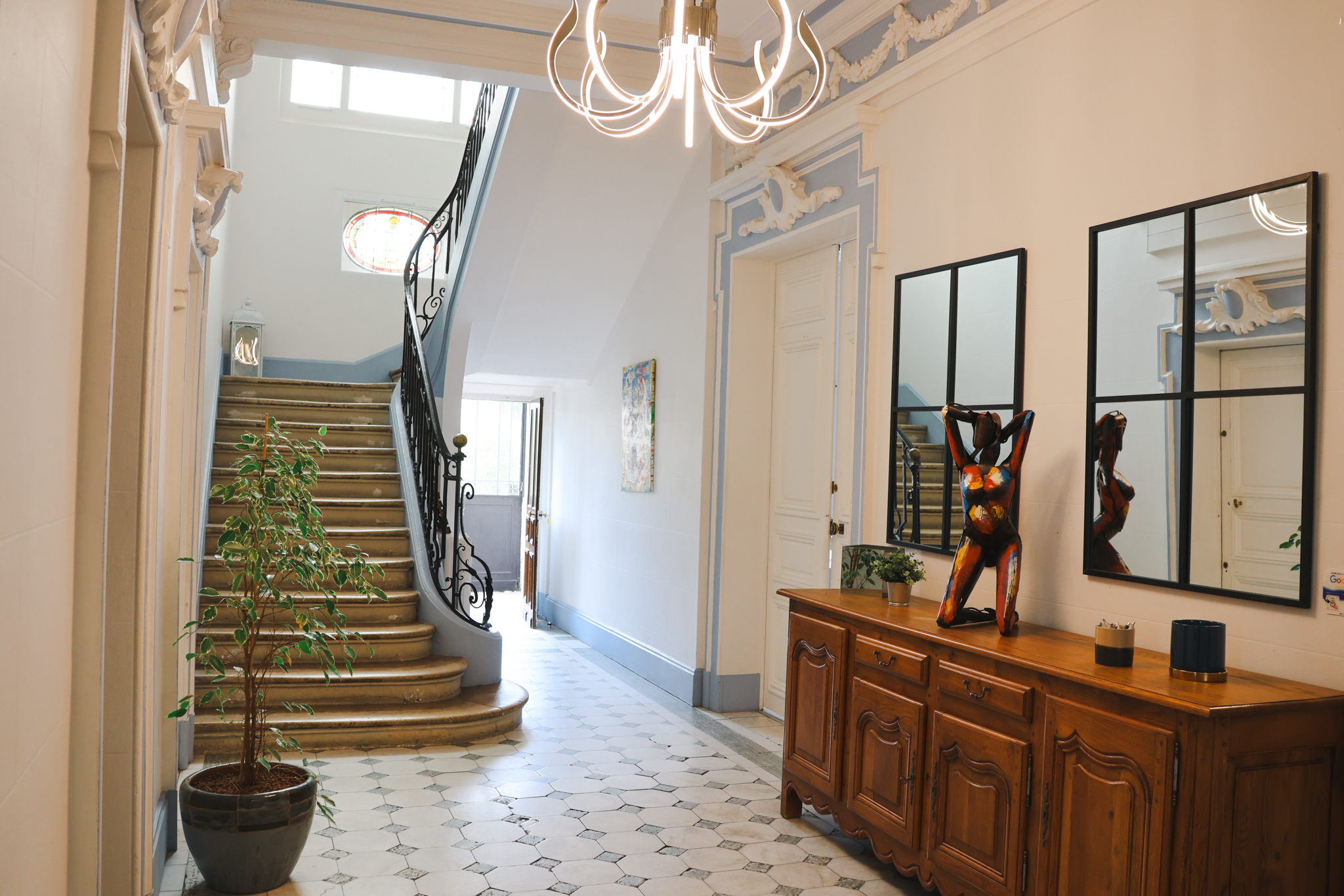 Vous profiterez également d’un élégant jardin paysager, véritable havre de verdure idéal pour les moments de détente ou les réceptions en extérieur. Le lieu dispose de 6 chambres spacieuses pouvant accueillir jusqu’à 15 personnes ainsi que de salles de réunion adaptées à tous vos projets.